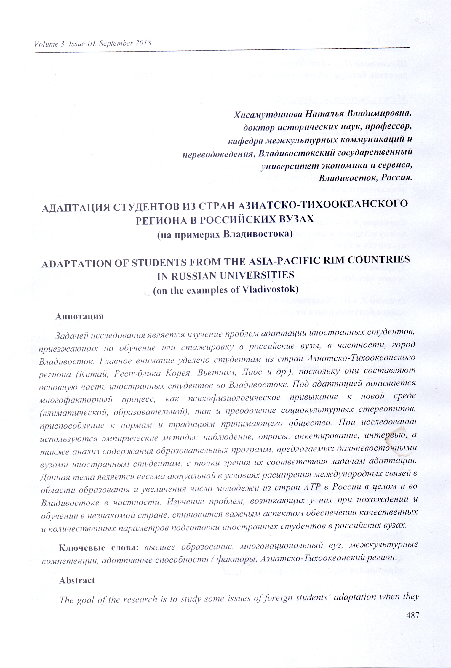 Адаптация студентов из стран Азиатско-Тихоокеанского региона в российских вузах (на примерах Владивостока)