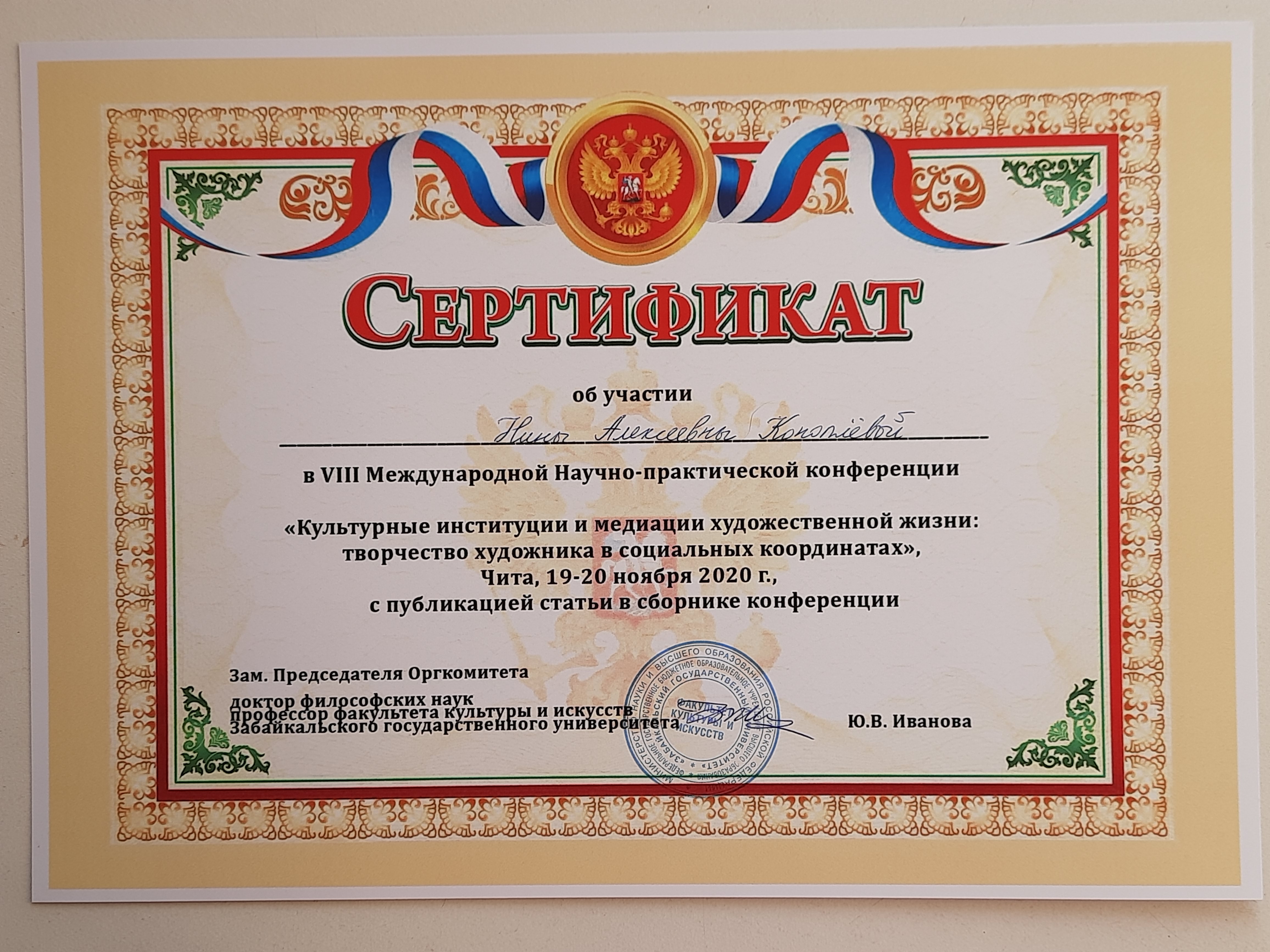 Сборник материаловмеждународной научно-практической конференции: Культурные институции и медиации художественной жизни: творчество художника в социальных координатах: материалы VIII международной научно-практической конференции / Забайкал. Гос. Ун-т ; [отв. ред. Д.В. Сергеев]. ‒ Чита : ЗабГУ, 2020. ‒ ____ с.