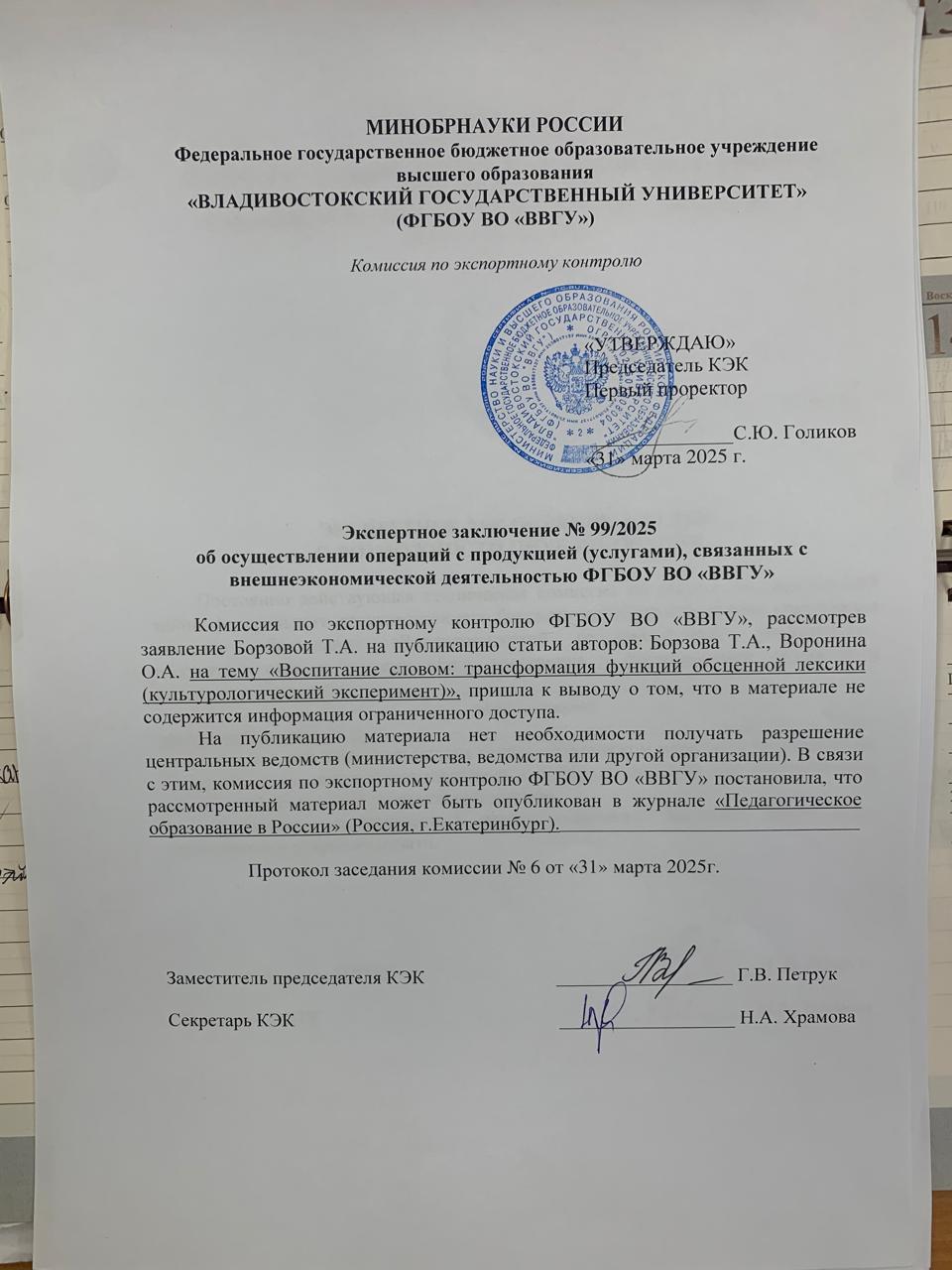 ВОСПИТАНИЕ СЛОВОМ: ТРАНСФОРМАЦИЯ ФУНКЦИЙ ОБСЦЕННОЙ ЛЕКСИКИ (КУЛЬТУРОЛОГИЧЕСКИЙ ЭКСПЕРИМЕНТ)