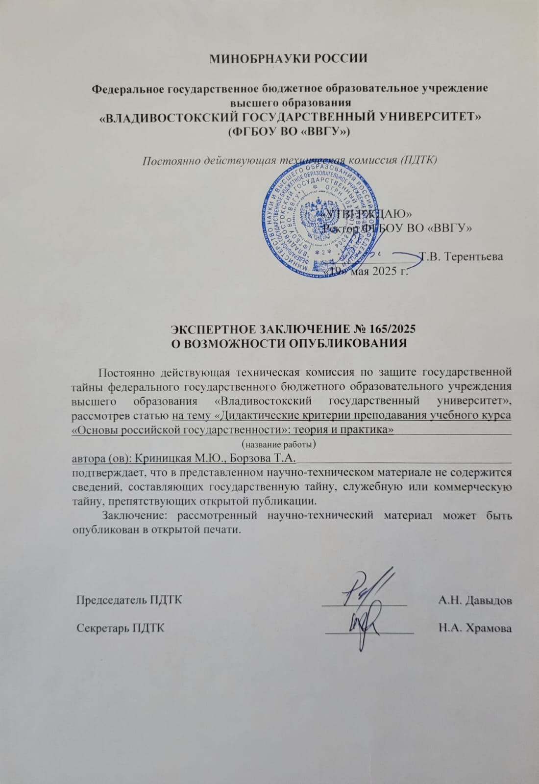 ДИДАКТИЧЕСКИЕ КРИТЕРИИ ПРЕПОДАВАНИЯ УЧЕБНОГО КУРСА «ОСНОВЫ РОССИЙСКОЙ ГОСУДАРСТВЕННОСТИ»: ТЕОРИЯ И ПРАКТИКА . Институт педагогики и лингвистики